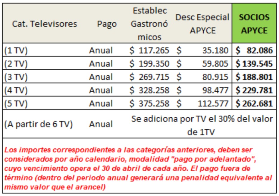 Recordamos que los socios de APYCE cuentan con el 30% de descuento de la tarifa que comunica a gastronómicos, siempre y cuando se realice el pago anual hasta el 30 de abril del corriente año. Los nuevos valores de este año son:
